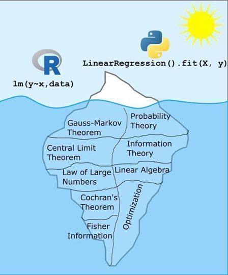 As the image shows, running a linear regression in R or Python is just the tip of the iceberg. What lies beneath, including the theory, assumptions, and reasoning that make those models work, is far more substantial and complex.